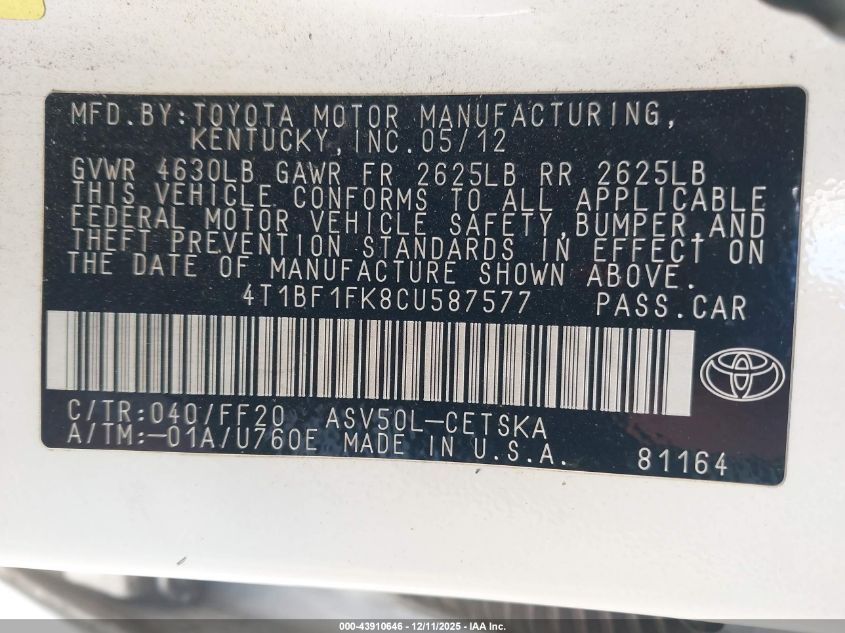 Автомобиль 2012 года — отличное сочетание качества, надёжности и выгоды. Компания Royal Motors предлагает пригнать TOYOTA CAMRY из США под ключ: мы проверяем авто по VIN (4T1BF1FK8CU587577), организуем доставку, растаможку и при необходимости выполняем ремонт на собственном СТО в Киеве. Модель имеет цвет Белый, работает на Бензин, оснащена двигателем 2.5 и приводом Передний привод. С Royal Motors вы получаете полностью проверенный автомобиль с прозрачной историей и выгодной ценой.