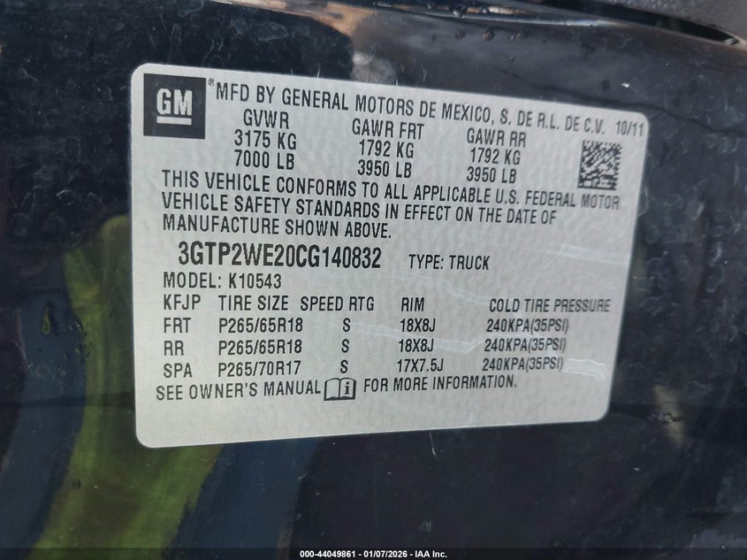 Колір ЧорнийЦиліндри 8Привід Повний привідVIN 3GTP2WE20CG140832Стан Заводиться та їде (перевірено)Ушкодження Передня або задняДата аукціона 2026-02-25