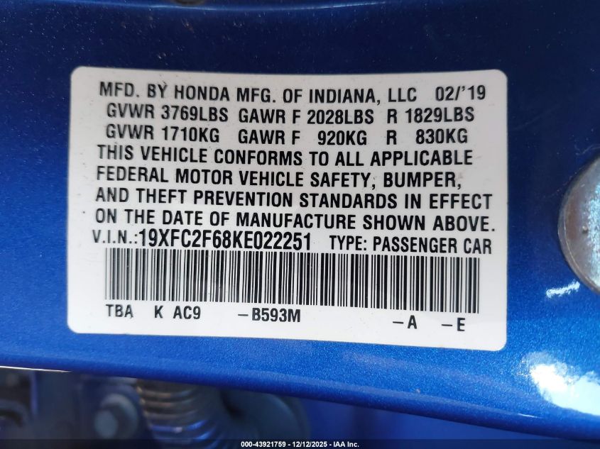 Автомобіль 2019 року — чудовий вибір для тих, хто цінує якість, надійність і вигоду. Компанія Royal Motors пропонує пригнати HONDA CIVIC з США під ключ: ми перевіряємо авто за VIN (19XFC2F68KE022251), організовуємо доставку, розмитнення та за потреби — ремонт на власному СТО в Києві. Ця модель має колір Синій, працює на Бензин, оснащена двигуном 2.0 і приводом Передній привід. З Royal Motors ви отримуєте повністю перевірений автомобіль із прозорою історією та вигідною ціною.