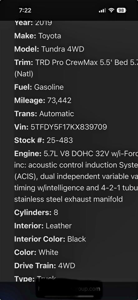 Автомобіль 2019 року — чудовий вибір для тих, хто цінує якість, надійність і вигоду. Компанія Royal Motors пропонує пригнати TOYOTA TUNDRA з США під ключ: ми перевіряємо авто за VIN (5TFDY5F17KX839709), організовуємо доставку, розмитнення та за потреби — ремонт на власному СТО в Києві. Ця модель має колір Білий, працює на Бензин, оснащена двигуном 5.7 і приводом 4x4 з заднім приводом. З Royal Motors ви отримуєте повністю перевірений автомобіль із прозорою історією та вигідною ціною.
